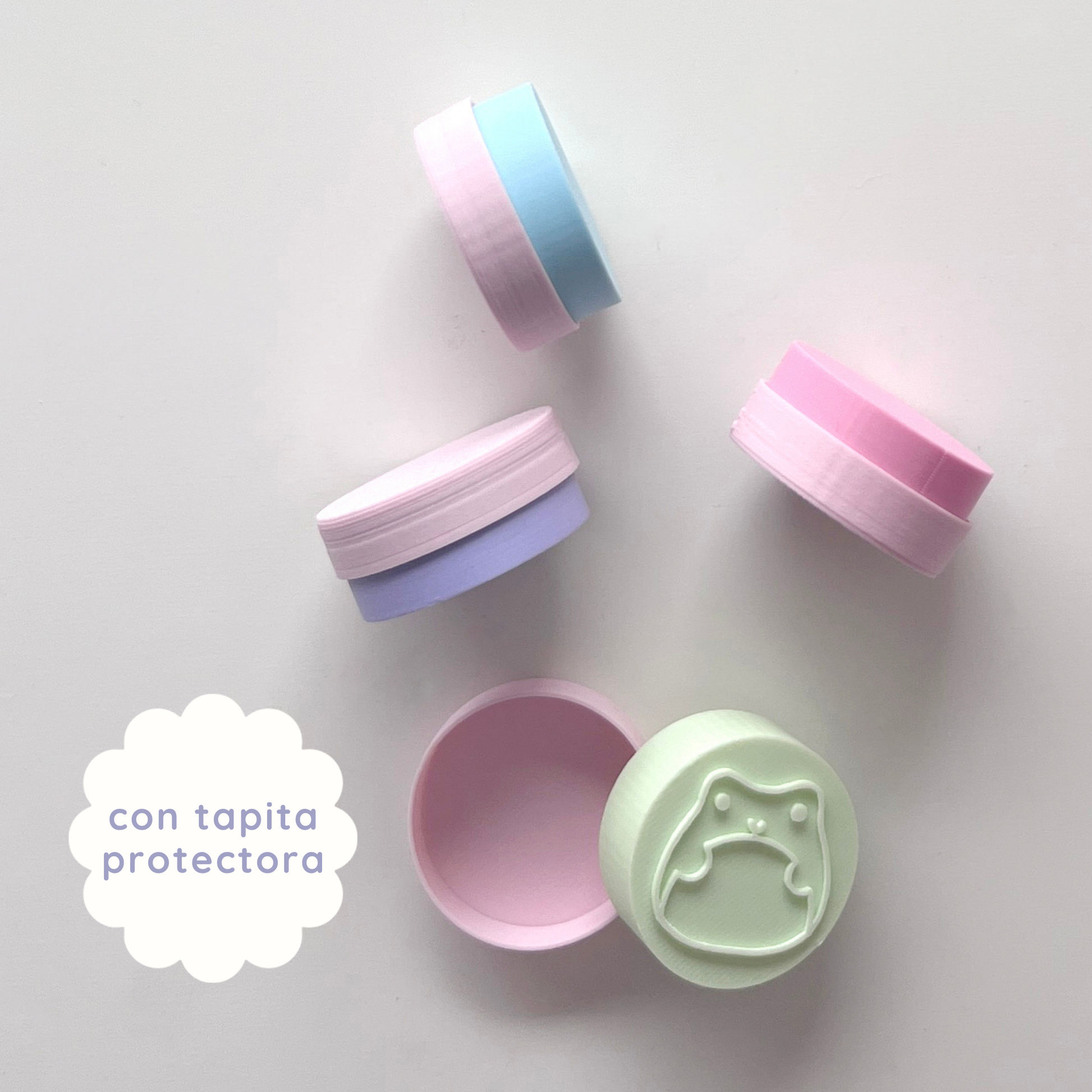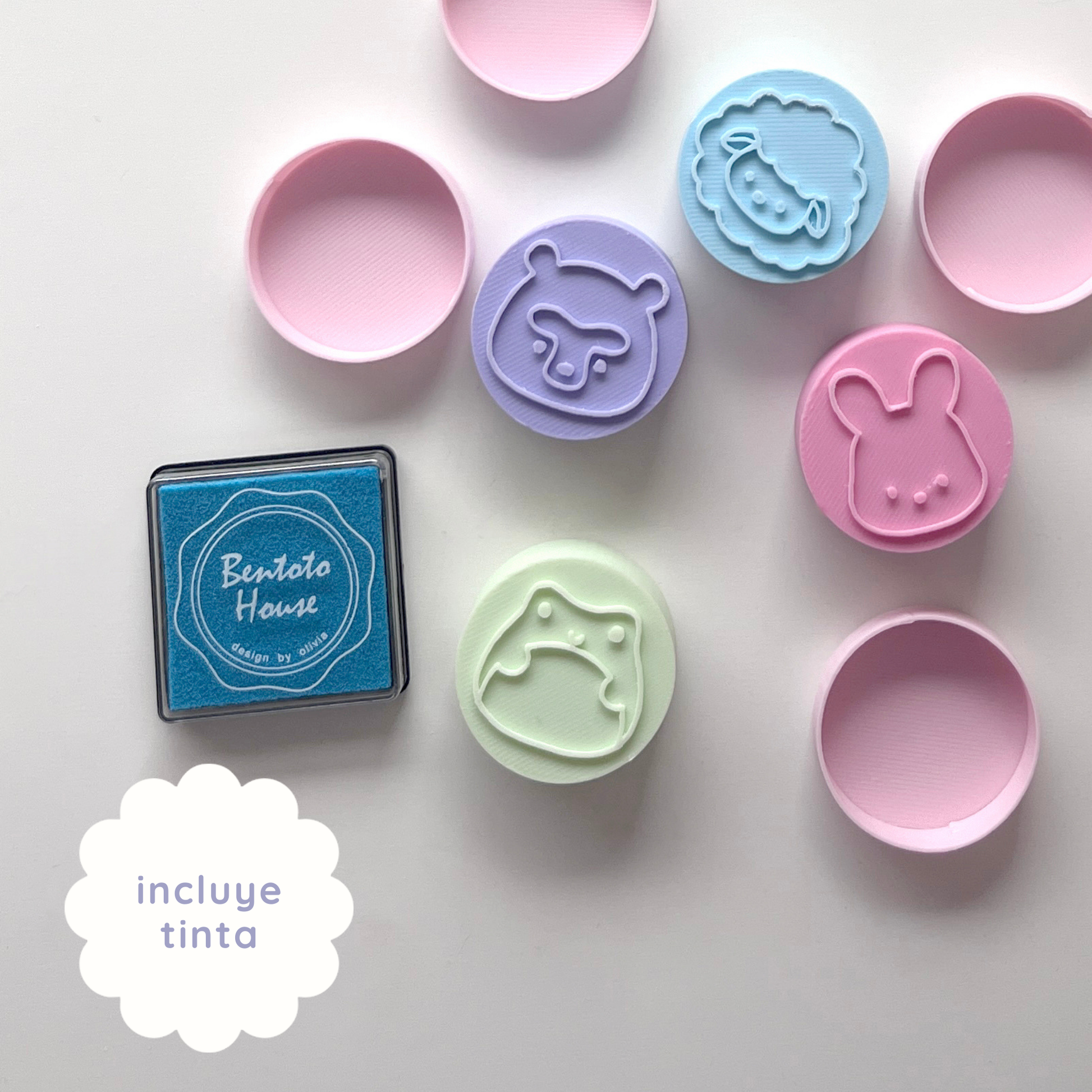 - 4 sellos impresos en 3D (3.5 cm de diámetro cada uno) con tapa protectora para evitar manchas.